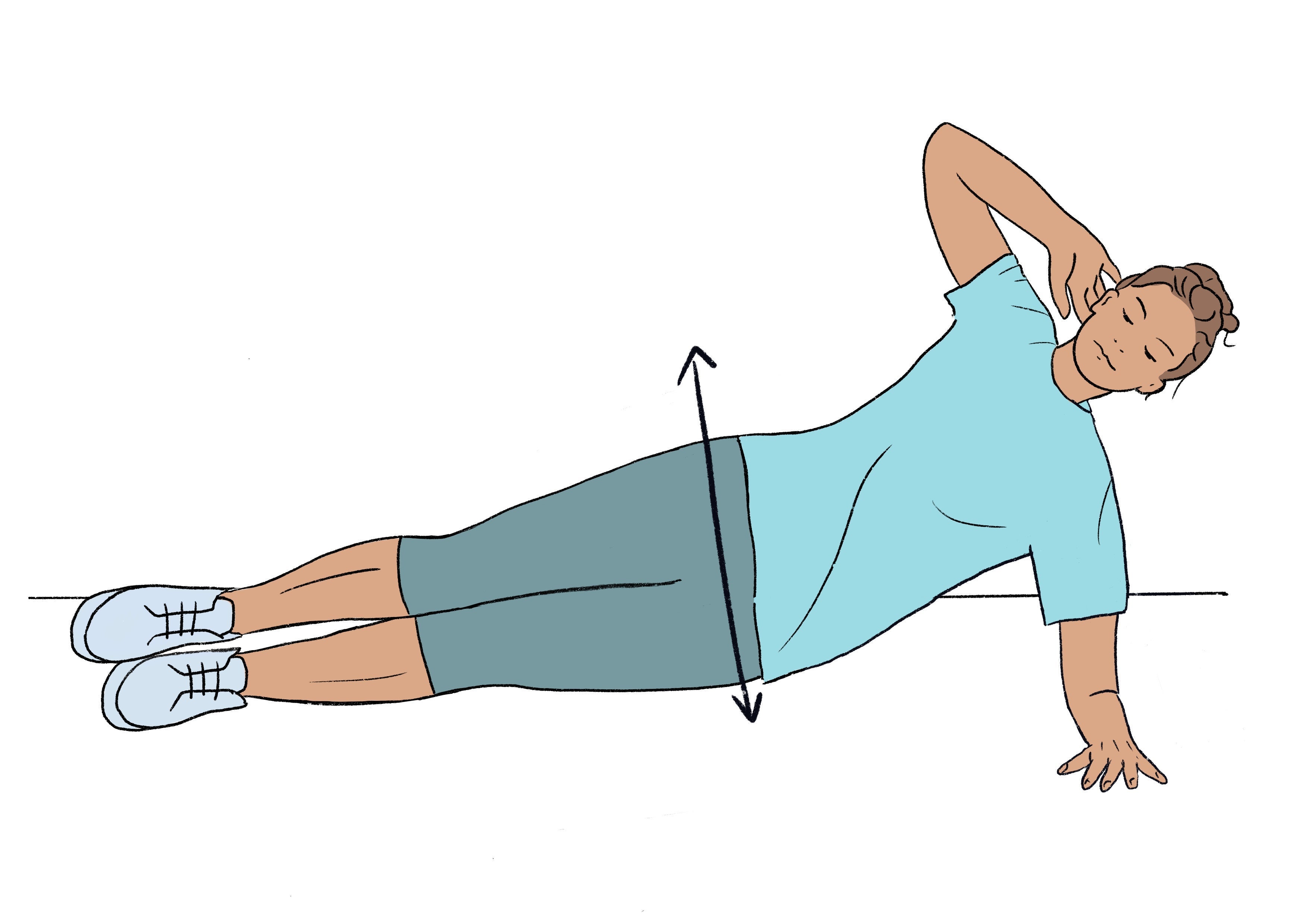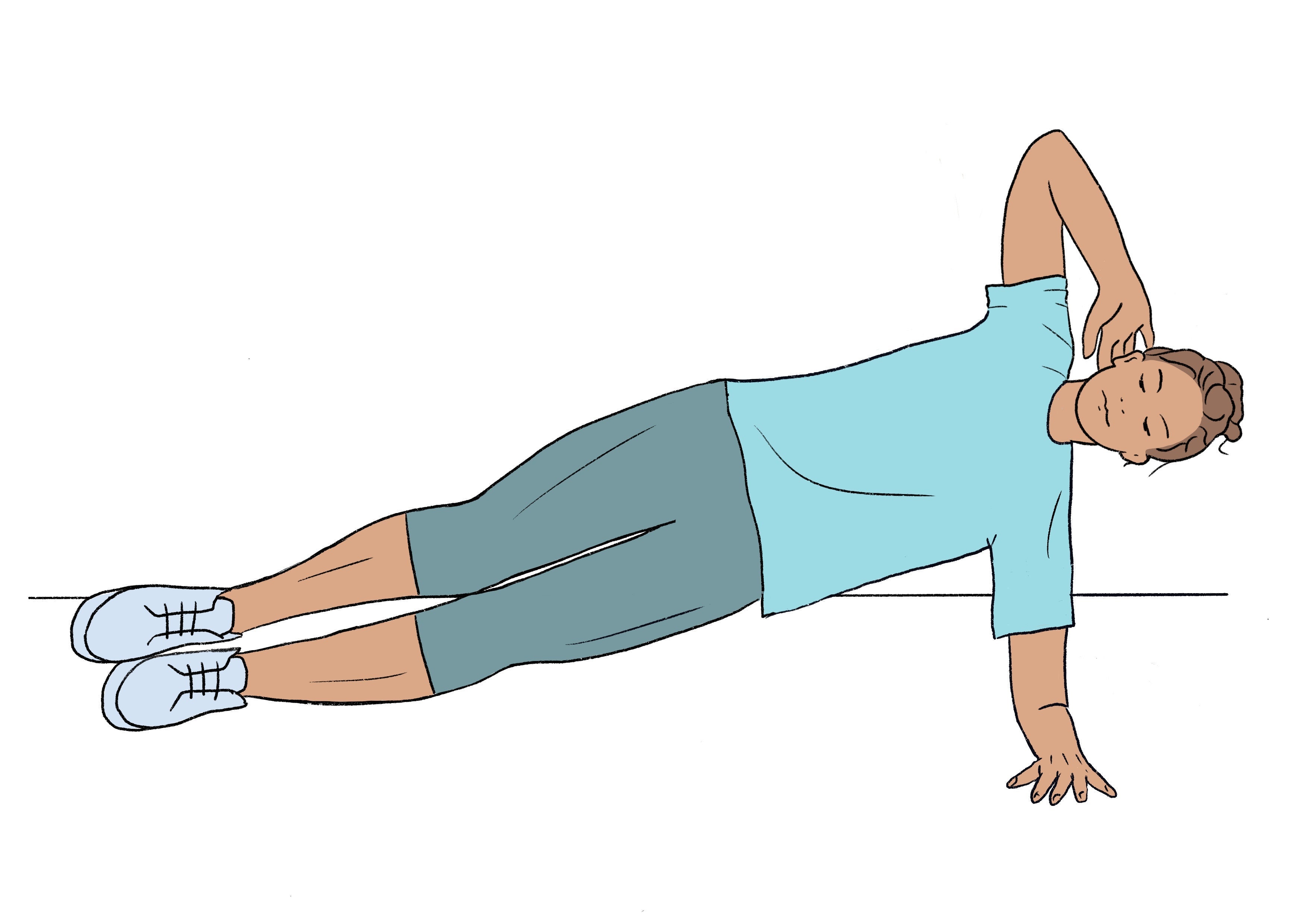 Auf die Seite legen, Beine gestreckt übereinander. Auf dem Unterarm abstützen, sodass der Ellbogen direkt unter dem Schultergelenk ist. Der andere Arm wird angewinkelt und hinter dem Kopf verschränkt.