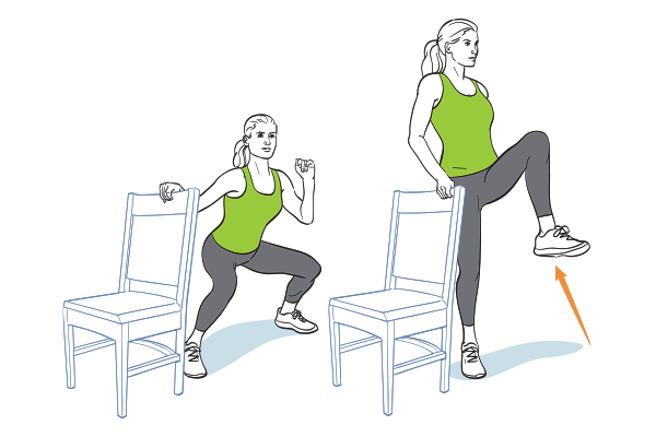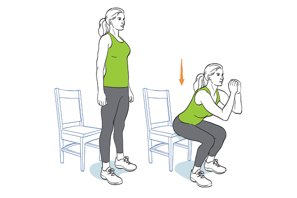 Übung: Drücke dich mit den Fersen ab und stehe auf. Setze dich langsam wieder hin, bis dein Po den Stuhl berührt.