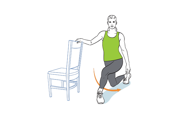 Ausgangsposition: Stelle dich hinter den Stuhl, sodass deine rechte Körperseite zum Stuhl zeigt. Halte dich mit der rechten Hand leicht an der Stuhllehne fest.