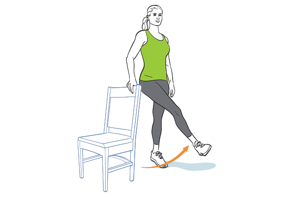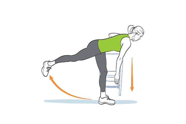 Ausgangsposition: Stelle dich hinter den Stuhl, sodass deine rechte Körperseite zum Stuhl zeigt. Halte dich mit einer Hand leicht an der Stuhllehne fest. Ziehe deine Schultern nach hinten und unten. Balanciere auf dem rechten Fuß. Lasse das rechte Knie dabei leicht gebeugt.
