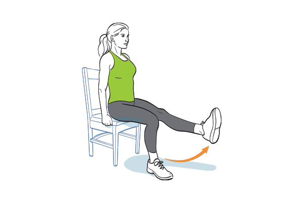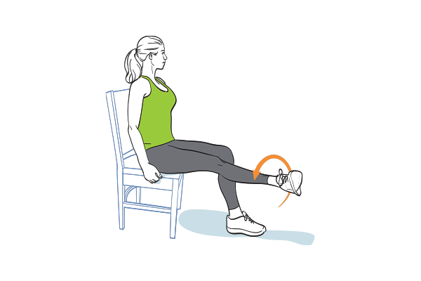 Ausgangsposition: Setze dich auf die Stuhlkante. Die Füße sind auf dem Boden, die Knie gebeugt. Strecke dein rechtes Bein aus und drehe die Zehen nach außen.
