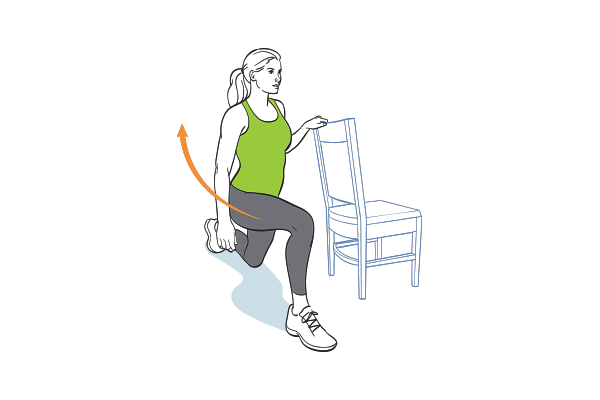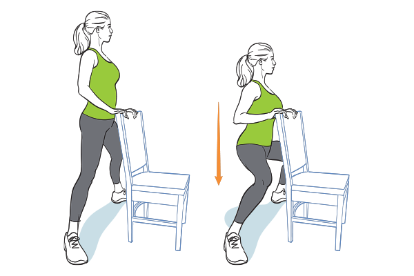Ausgangsposition: Stelle dich hinter den Stuhl. Deine Füße stehen hüftbreit auseinander auf dem Boden, deine Knie sind leicht gebeugt. Halte dich leicht an der Stuhllehne fest.