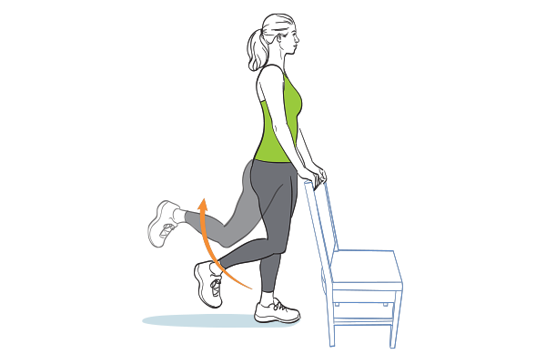 Ausgangsposition: Stelle dich hinter den Stuhl, deine Füße stehen hüftbreit auseinander auf dem Boden. Die Knie sind leicht gebeugt. Halte dich leicht an der Stuhllehne fest. Balanciere auf deinem linken Fuß und beuge das rechte Knie um etwa 45 Grad.