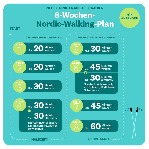 Nordic-Walking-Trainingsplan für Anfänger: 8 Wochen auf einen Blick