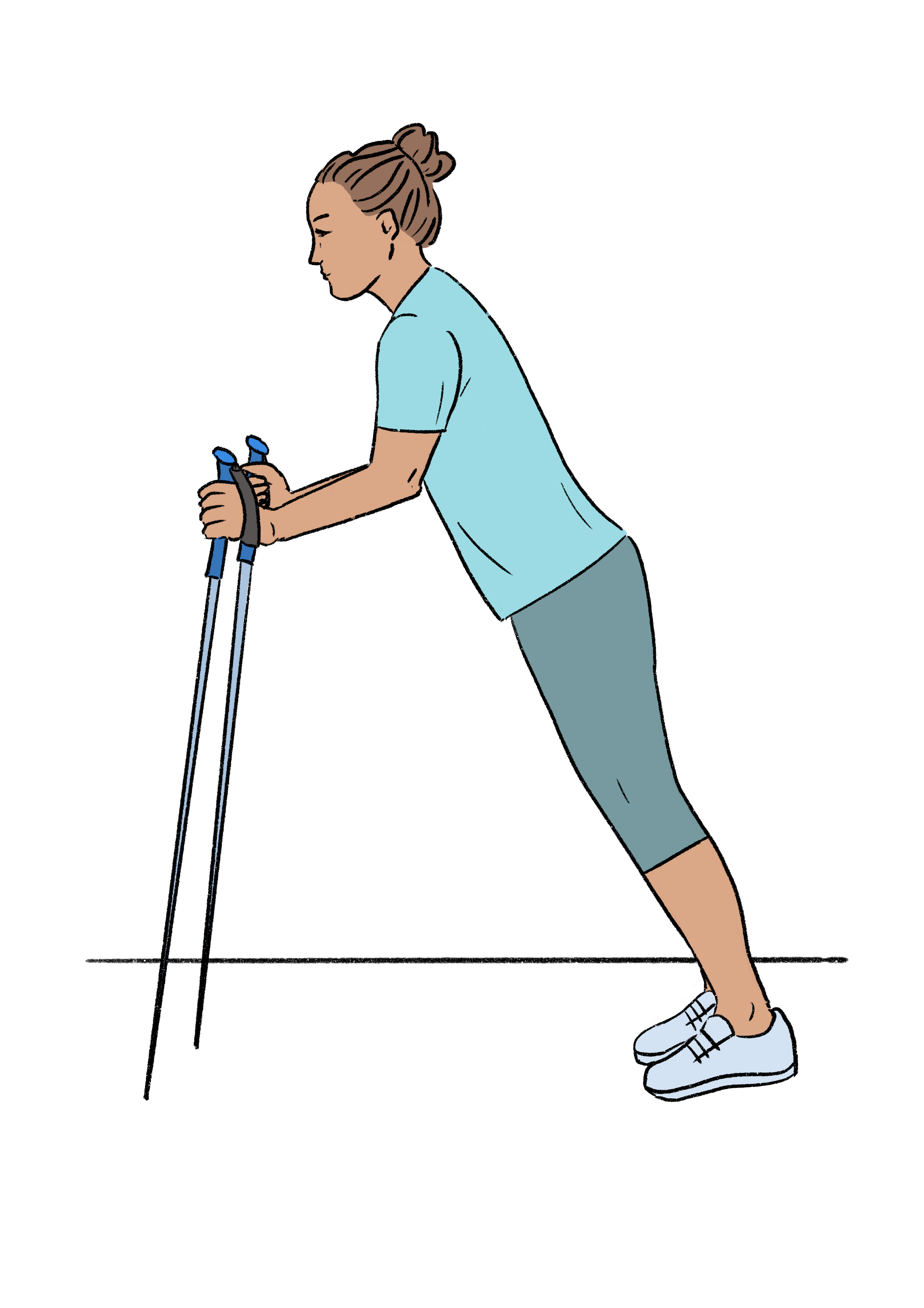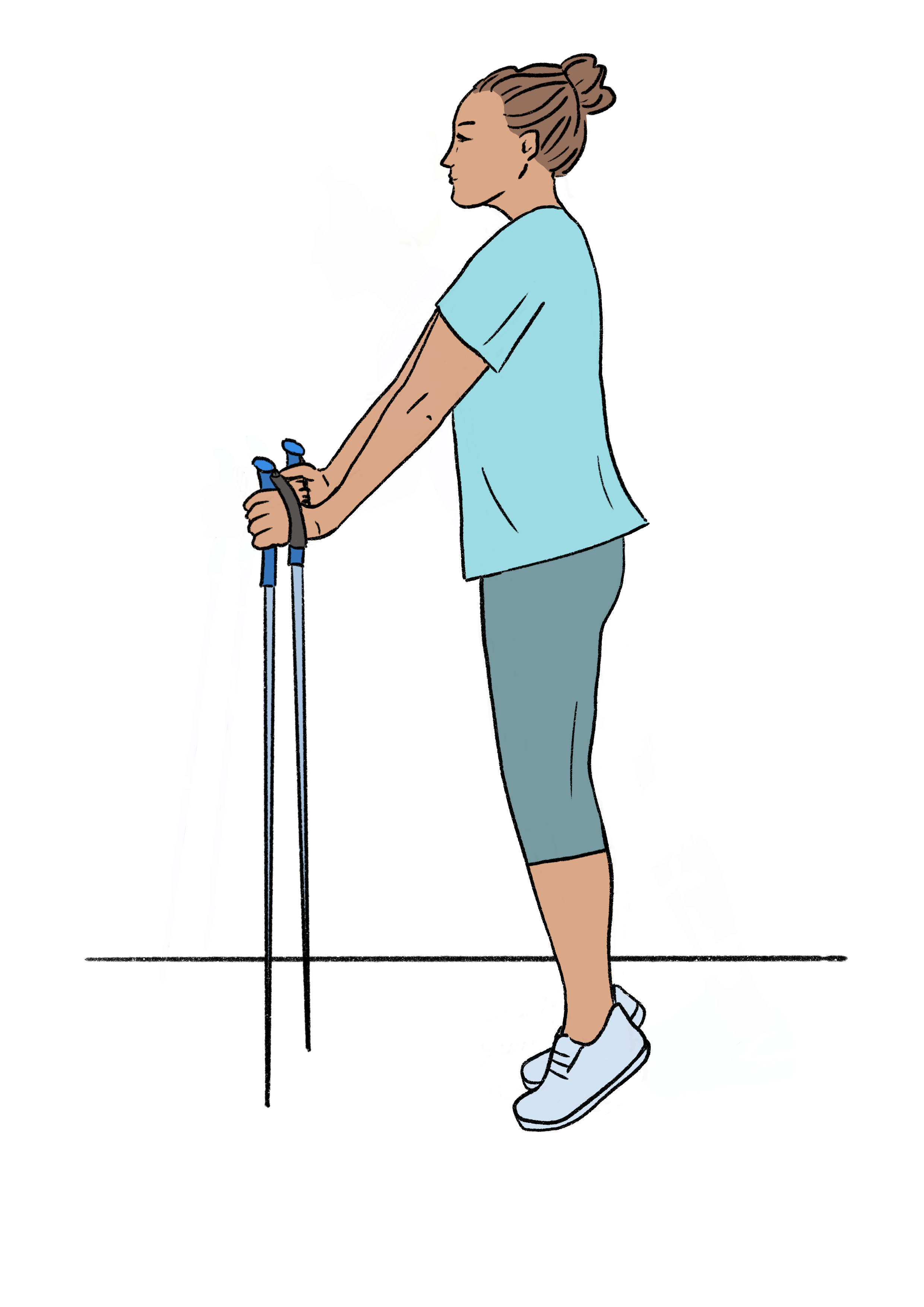 Stelle die Walkingstöcke jeweils seitlich am Körper ab.