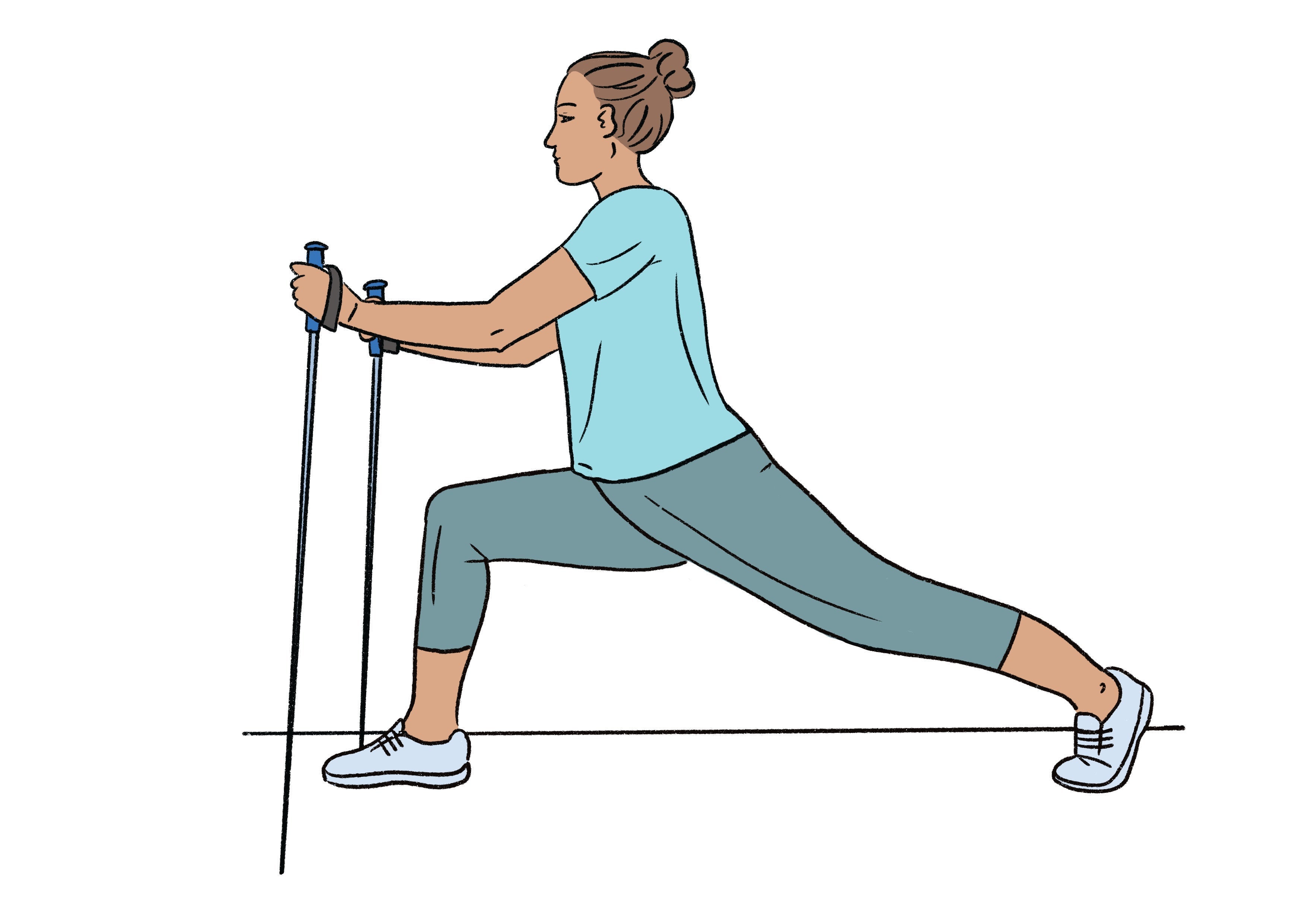 Die Walkingstöcke stellst du rechts und links neben den vorderen Fuß ab.