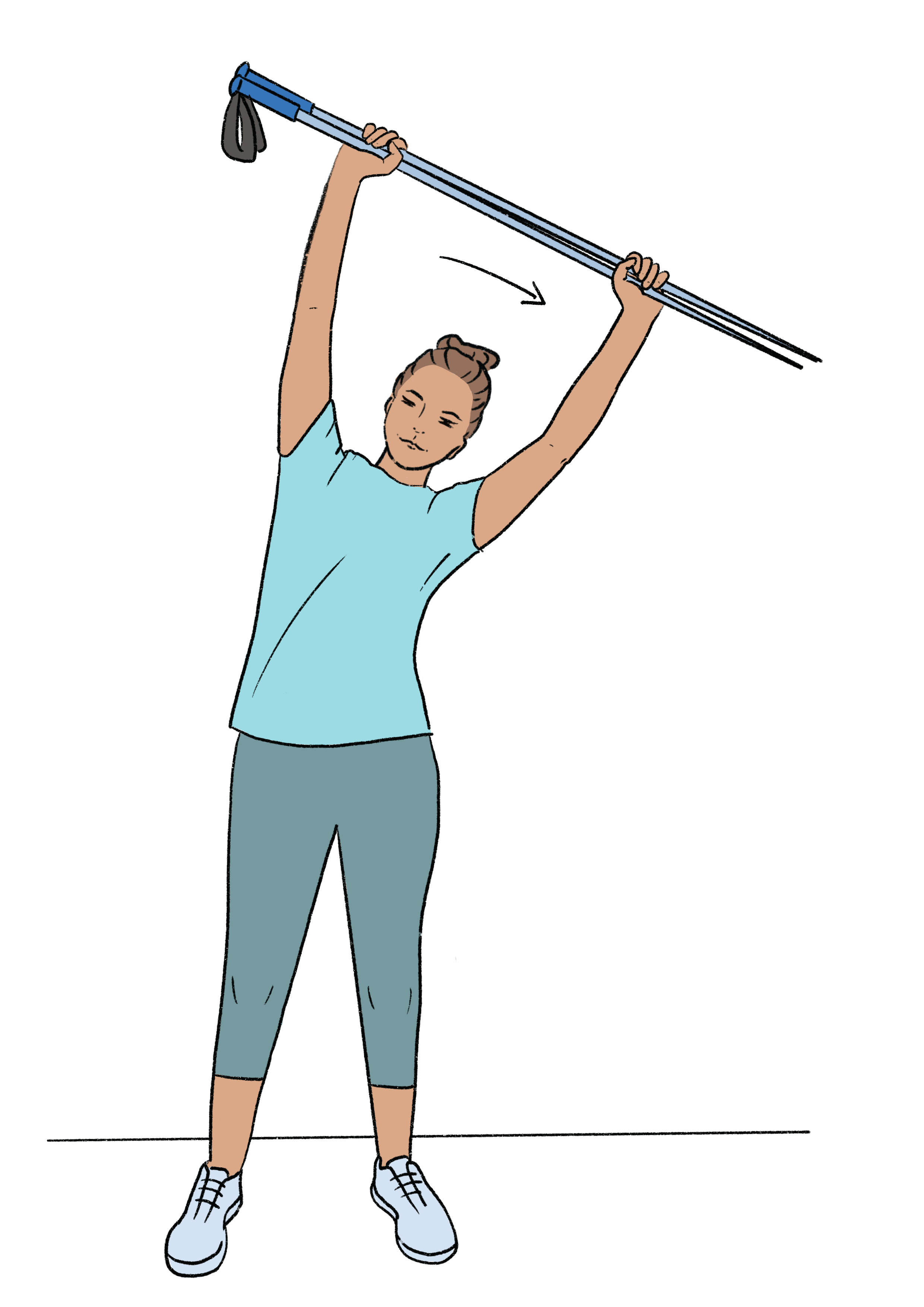 Nimm beide Walkingstöcke in die Hände (etwas mehr als schulterbreit) und strecke die Arme nach oben. Die Handrücken zeigen nach hinten.