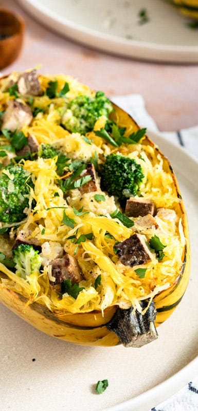 Aber das Beste: Du kannst den Kürbis auch essen wie Nudeln, aber Low Carb. Oder aber du bereitest ihn als bunt gefüllten Ofenkürbis zu!