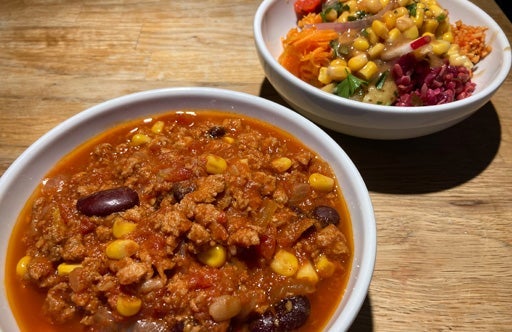 Chili sin Carne und Salat im veganen Restaurant