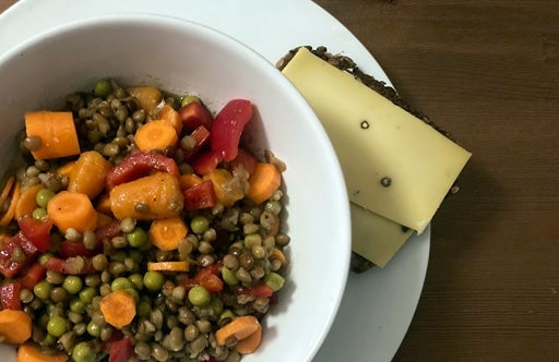 Linsensalat und Brot mit veganem Käse