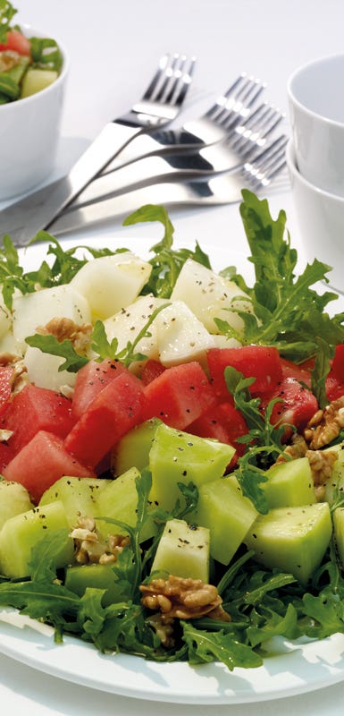 Sommerzeit ist Melonenzeit. Sie schmecken nicht nur herrlich süß, sondern enthalten ca. 90 bis 95 % Wasser und löschen an warmen Tagen auch den Durst. Mit ihrem hohen Wasseranteil und 38 kcal/pro 100 g ist die Wassermelone der ideale leichte Sommersnack.