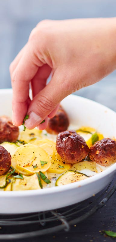 Die Zucchini gehört zu den Kürbisgewächsen, ihr Name bedeutet “kleiner Kürbis”. Neben der bekannten grünen Zucchini, gibt es sie auch in gelb, rund, klein und groß. Aufgrund des hohen Wassergehalts enthält sie wenig Kalorien, dafür aber reichlich Kalium, Calcium, Phosphor, Eisen, Vitamin A und C. Ein ideales Sommergemüse also, dass sowohl gedünstet, gebraten oder aus dem Backofen schmeckt. Zucchini harmoniert mit Hackfleisch, aber auch mit Tomaten, Knoblauch, Paprika und mediterranen Kräutern.