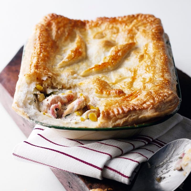 Backofen auf 220° C (Gas: Stufe 4, Umluft: 200° C) vorheizen. Blätterteig ausrollen und auf den Auflauf legen. Überstehenden Teig abschneiden und die Teigstreifen auf die Teighaube legen. Den Rand mit einer Gabel andrücken. Eiweiß steif schlagen und die Teighaube damit bestreichen. Auflauf im Backofen auf mittlerer Schiene ca. 20–25 Minuten garen und servieren.