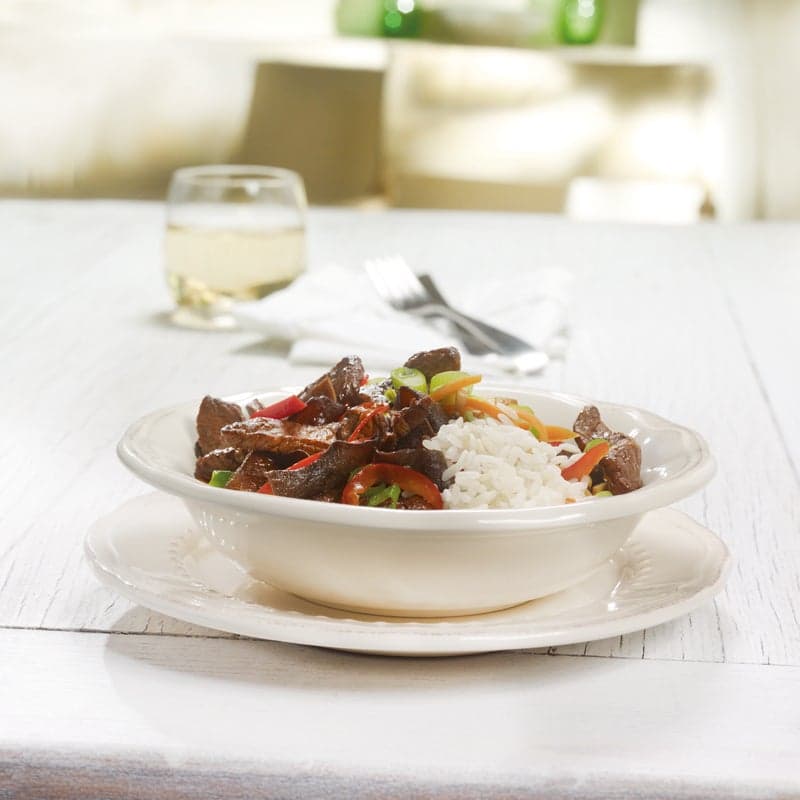 Restliches Öl in einer Pfanne erhitzen und Rindersteakstreifen darin von jeder Seite ca. 5–8 Minuten braten. Fleisch herausnehmen und Gemüse im Bratensaft ca. 5–8 Minuten anbraten. Steakstreifen untermischen, kurz erwärmen und mit Reis servieren.