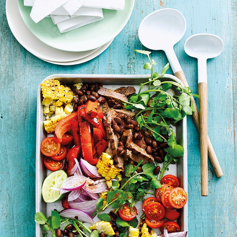 Kidneybohnen abspülen und abtropfen lassen, Tomaten und Wasserkresse waschen. Wasserkresse trocken schleudern. Tomaten halbieren. Zwiebeln schälen und in Streifen schneiden. Mit einem scharfen Messer die Maiskörner vom Kolben runterschneiden und zusammen mit Paprikastreifen, Kidneybohnen, Tomatenhälften, Wasserkresse, Zwiebel- und Steakstreifen in eine Schüssel geben. Mit restlichem Öl und Limettensaft beträufeln und mit Salz und Pfeffer würzen. Bunten Steak-Bohnen-Salat servieren.