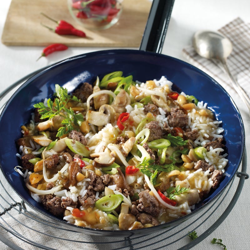 3. Reis unterheben. Mit Salz und Pfeffer abschmecken und Chinapfanne mit Pilzen servieren.