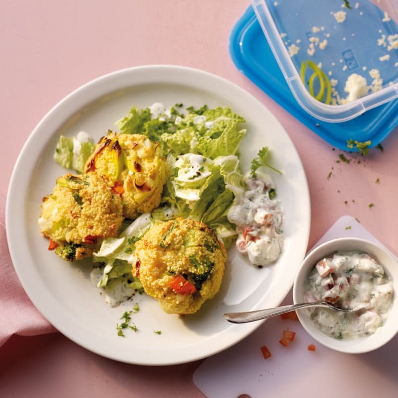 Backofen auf 200° C (Gas: Stufe 3, Umluft: 180° C) vorheizen. Gemüsecouscous mit Eiern verkneten, salzen, pfeffern und zu 6 Bratlingen formen. Bratlinge auf ein mit Backpapier ausgelegtes Backblech legen und im Backofen auf oberer Schiene ca. 20–25 Minuten backen.