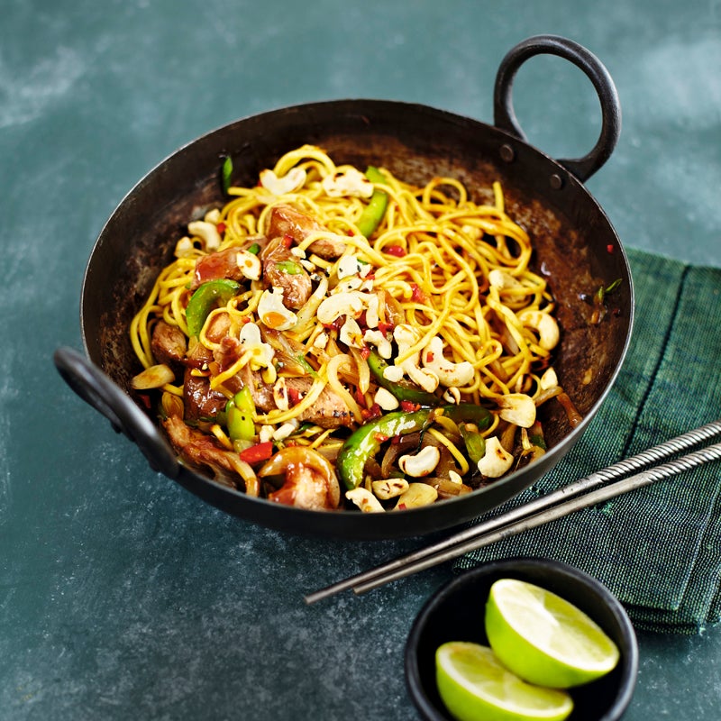 Nudeln, Saucenmischung und Cashewkerne dazugeben. Vom Herd nehmen und alles im Wok gut verrühren. Chilischote waschen, entkernen und fein würfeln. Das Gericht mit Chili bestreut servieren.