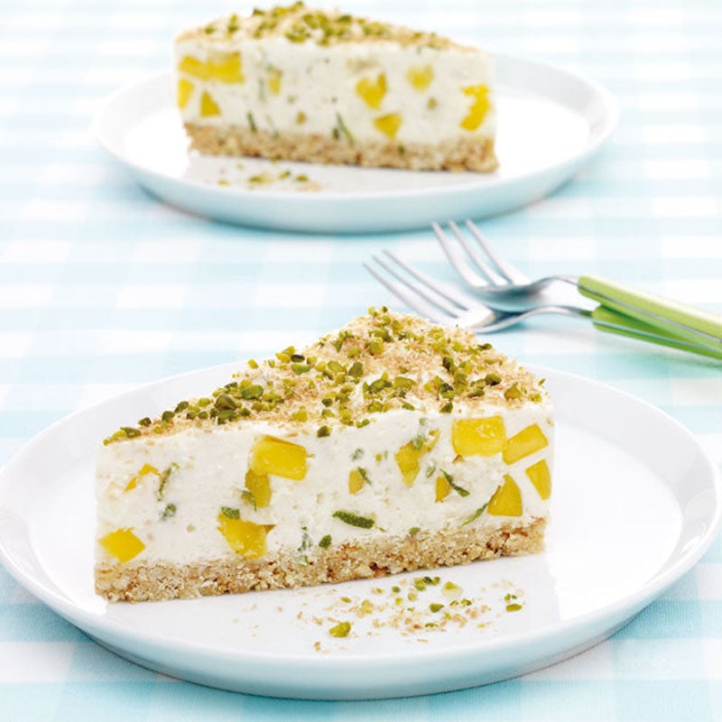 Creme auf den Boden streichen und Torte ca. 3 Stunden im Kühlschrank fest werden lassen. Mit restlichen Kokosraspeln und Pistazien bestreut servieren.