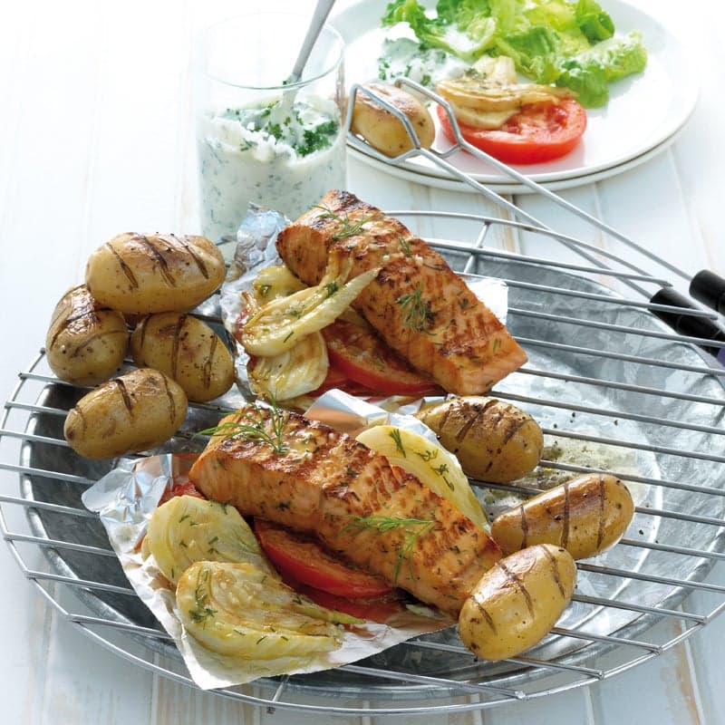 Für den Dip Quark mit Mineralwasser glatt rühren. Knoblauch pressen und mit Kräutern unterrühren, salzen und pfeffern. Lachspäckchen ca. 20–25 Minuten auf dem Grill garen. Kartoffeln auf dem Grill ca. 5–10 Minuten rundherum grillen. Lachspäckchen mit Grillkartoffeln, Kräuterdip und nach Wunsch mit frischem Salat servieren.