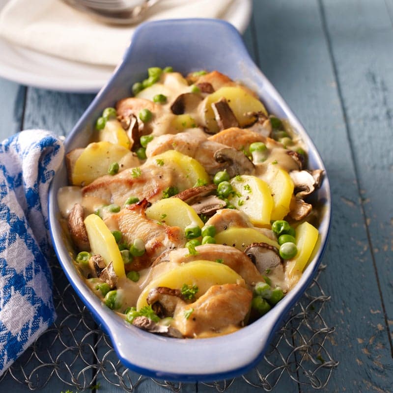 Kartoffeln abgießen, pellen und in Scheiben schneiden. Kartoffelscheiben abwechselnd mit Putenbruststreifen, Erbsen und Champignons in eine Auflaufform (24 cm x 28 cm) schichten und mit Salz und Pfeffer würzen.