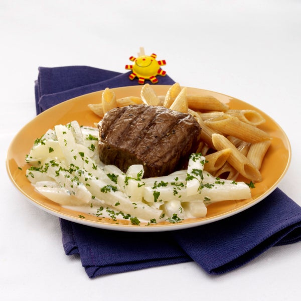 Rindersteaks mit Küchenpapier trocken tupfen, salzen und pfeffern. Öl in einer Pfanne erhitzen und Steaks darin von jeder Seite ca. 3–5 Minuten braten. Kohlrabi mit Schmelzkäse und Petersilie verfeinern und mit Salz und Pfeffer abschmecken. Nudeln abgießen und mit Käsekohlrabi und Steaks servieren.