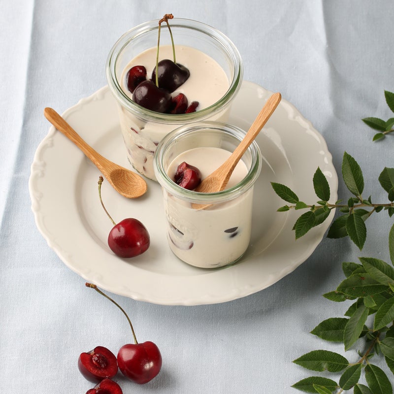 Kirschen waschen, entkernen, halbieren und unter den Joghurt mischen. KiBa-Joghurt in Gläser servieren.