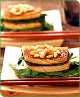 Spinat auf Tellern anrichten und den Tofu darauf verteilen. Mit Pinienkernen bestreuen.