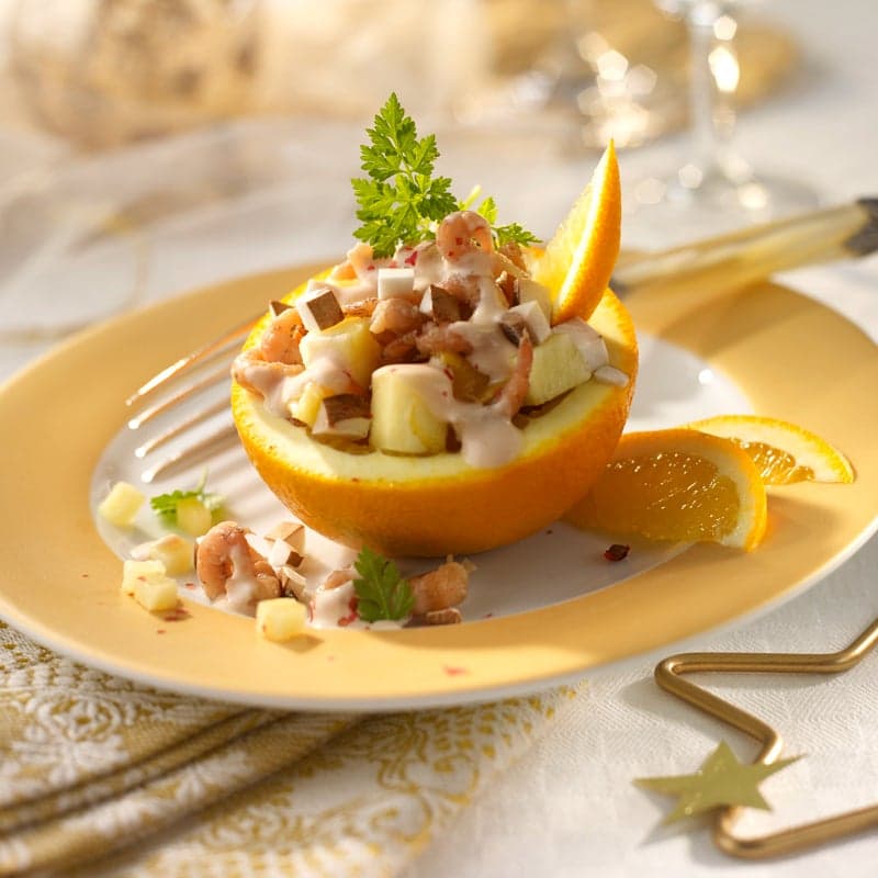 2 Orangen halbieren und aushöhlen. Das Fruchtfleisch, Champignons und halbe Ananas würfeln und mit küchenfertigen Krabben vermischen. Mit dem Dressing überziehen, salzen und pfeffern. Krabbencocktail in den ausgehöhlten Orangen anrichten und servieren.