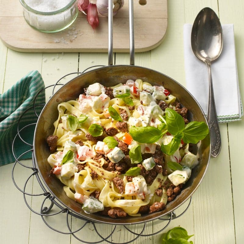 Nudeln nach Packungsanweisung in Salzwasser garen. Tatar in Öl anbraten, salzen und pfeffern. Zucchini, Zwiebel und Paprika klein schneiden und mit gepresster Knoblauchzehe zum Fleisch geben und weiter garen.