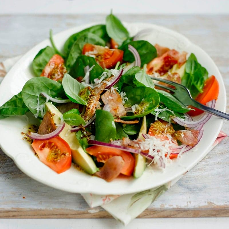 Spinatsalat mit Avocado und knusprigem Bacon