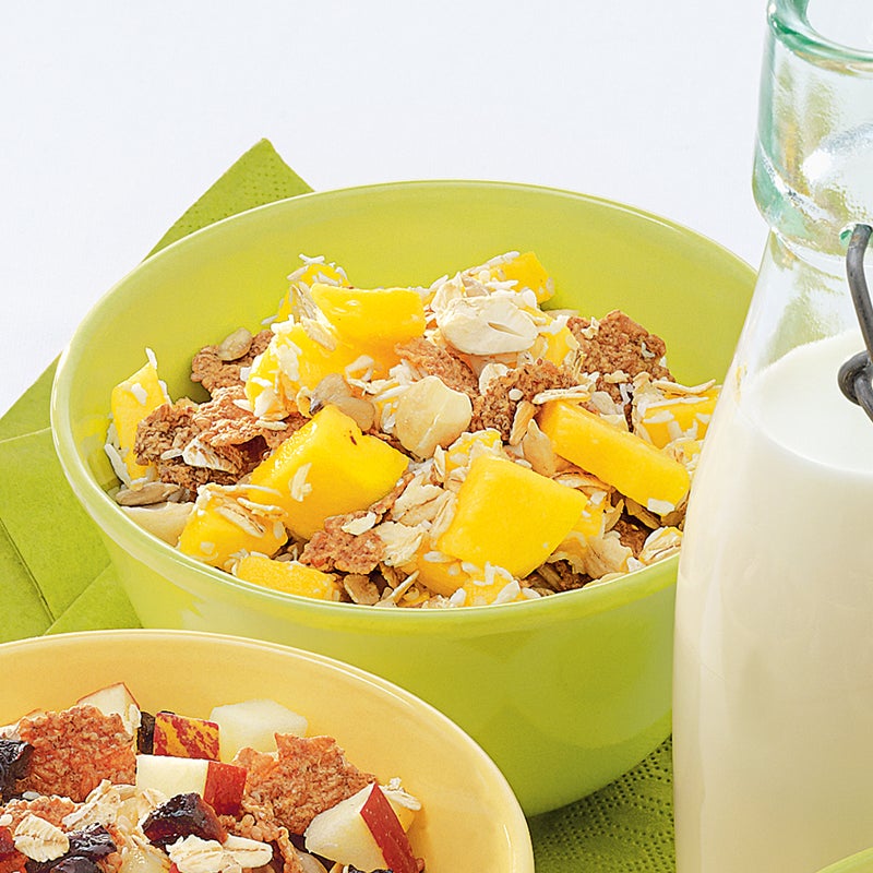 Mango schälen, das Fruchtfleisch vom Stein schneiden und ein Viertel davon klein würfeln. Mit Kokosraspel und Cashewnüssen unter das Müsli-Grundrezept mischen. Servieren Sie die restliche Mango in Spalten geschnitten dazu.