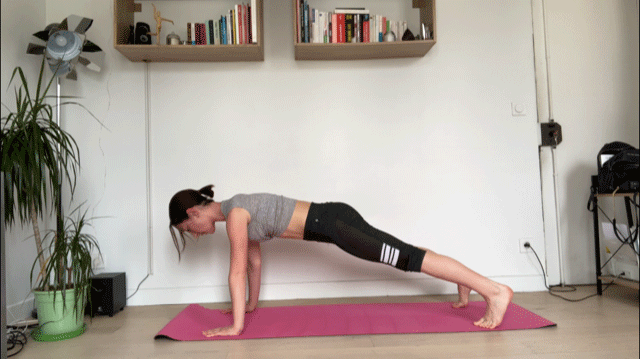 Placez-vous en planche sur les mains et les pieds, avec les épaules, le bassin et les chevilles alignés. Contractez vos abdominaux et serrez vos fessiers. Ensuite, soufflez en fléchissant votre bassin pour vous placer en chien tête en bas, en poussant le sol avec vos mains, tout en gardant les épaules vers le bas. Pour étirer l’arrière de vos jambes, essayez de rapprocher vos talons du sol le plus possible. Puis revenez à la position de départ en inspirant. Répétez 10 à 12 fois.