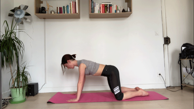 Placez-vous à quatre pattes avec le dos bien droit. Puis soufflez et repoussez votre bassin vers l’arrière en écartant bien les genoux, jusqu’à ce que vous puissiez poser vos fessiers sur vos chevilles. Posez votre front sur le sol et relâchez complètement votre tête. Restez quelques secondes dans cette position, puis en inspirant, revenez à la position initiale et répétez 10 à 12 fois.