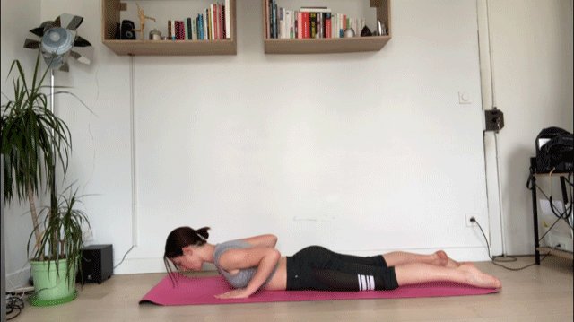 Allongez-vous sur le ventre et placez vos mains à plat sur le sol à la hauteur de votre poitrine. Inspirez, puis soufflez en poussant sur vos mains pour décoller le haut du corps du sol. Gardez les coudes légèrement fléchis et tenez quelques secondes pour sentir l’étirement de vos abdominaux. Puis relâchez tout doucement en inspirant. Répétez 10 à 12 fois.