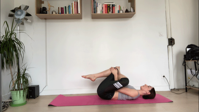 Allongez-vous sur le dos cette fois-ci. Fléchissez vos deux genoux et croisez votre cheville droite sur votre genou gauche. Placez vos deux mains sur votre genou gauche et soufflez en le tirant légèrement vers votre poitrine. Vous devriez sentir l’étirement de votre fessier droit. Ensuite, relâchez votre genou en inspirant. Recommencez 10 à 12 fois et répétez avec l'autre jambe.