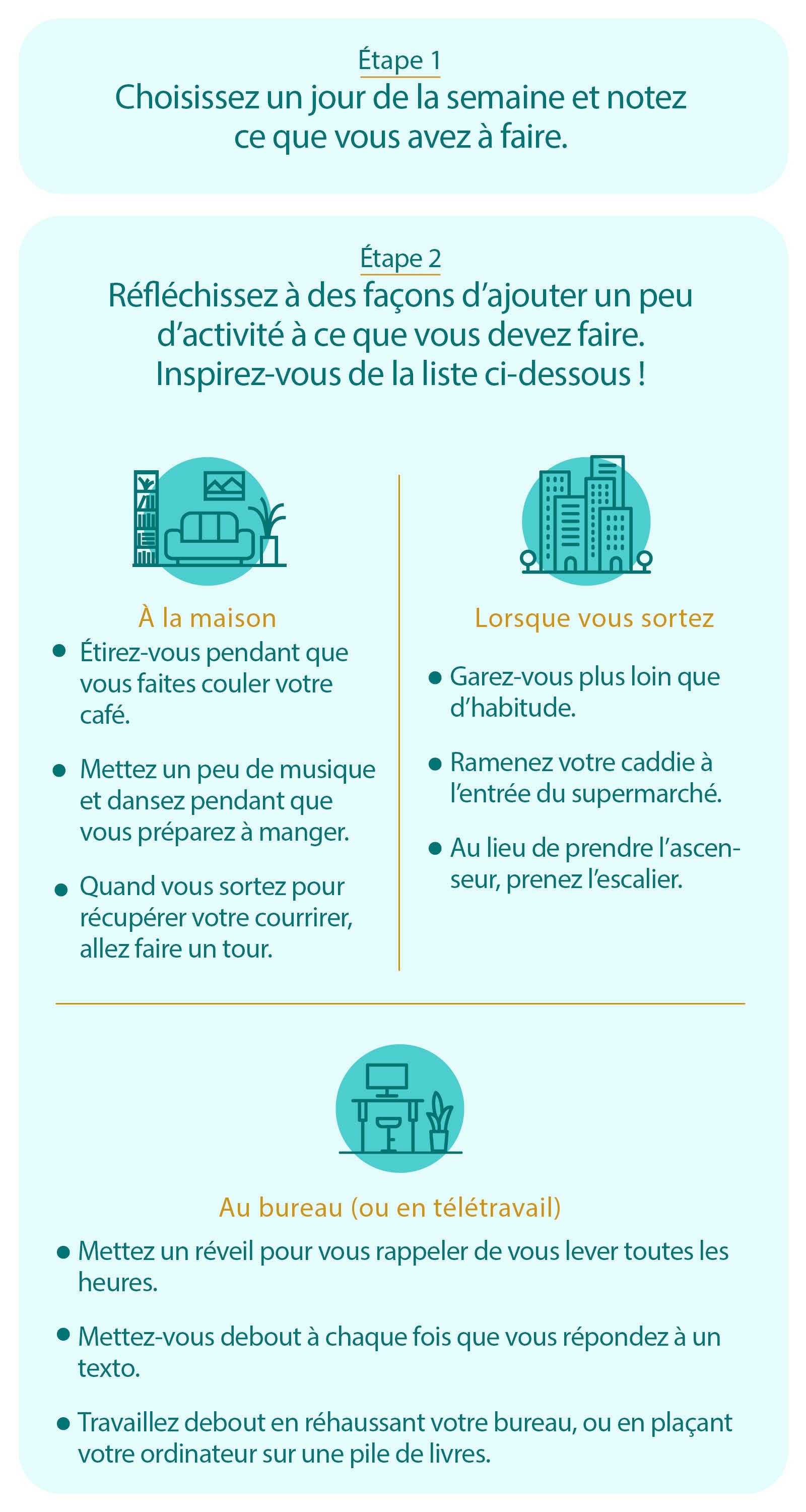 Réfléchissez à des façons de bouger qui rentrent dans le planning de votre semaine, même si elles vous paraissent courtes. Plus elles vous paraissent faisables, plus vous vous y tiendrez. Et chaque jour où vous êtes un peu plus actif ou active, félicitez-vous !