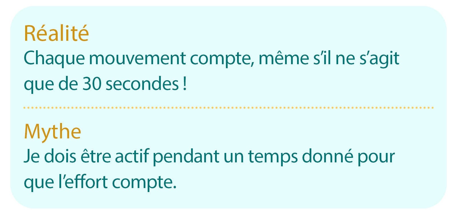 Nous avons tendance à nous dire « Si je ne peux pas m'entraîner pendant au moins 30 minutes, cela n'a pas d'intérêt ». Mais il vaut toujours mieux bouger un peu que pas du tout. Ce n'est pas « tout ou rien ».