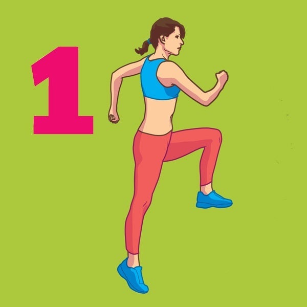 1 x 30 secondes de jogging lent: lorsque vous courez sur place, veillez à ce que votre dos soit bien droit et que vous maintenez bien votre tête. Aidez vous de vos bras pour simuler le mouvement droite-gauche (bras du côté inverse à celui du genou levé). Lèvez le genou aussi haut que possible. Si vous êtes débutante, vous pouvez simplement marcher sur place. Veillez à ce que le pied qui reste au sol soit bien maintenu et fixe.