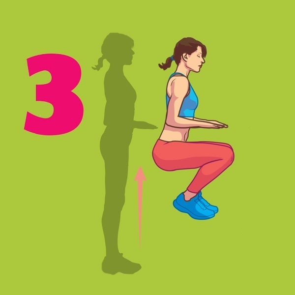 15 répétitions: pliez les genoux sur place comme si vous voulez vous asseoir sur une chaise. Les pieds sont alignés à la hauteur des épaules. Les bras sont le long du corps. Maintenez le dos bien droit. Inspirez lorsque vous sautez. Vous devez atterrir sur le plat du pied (pas sur les talons). Pliez légèrement les genoux lorsque vous touchez le sol pour amortir le choc.
