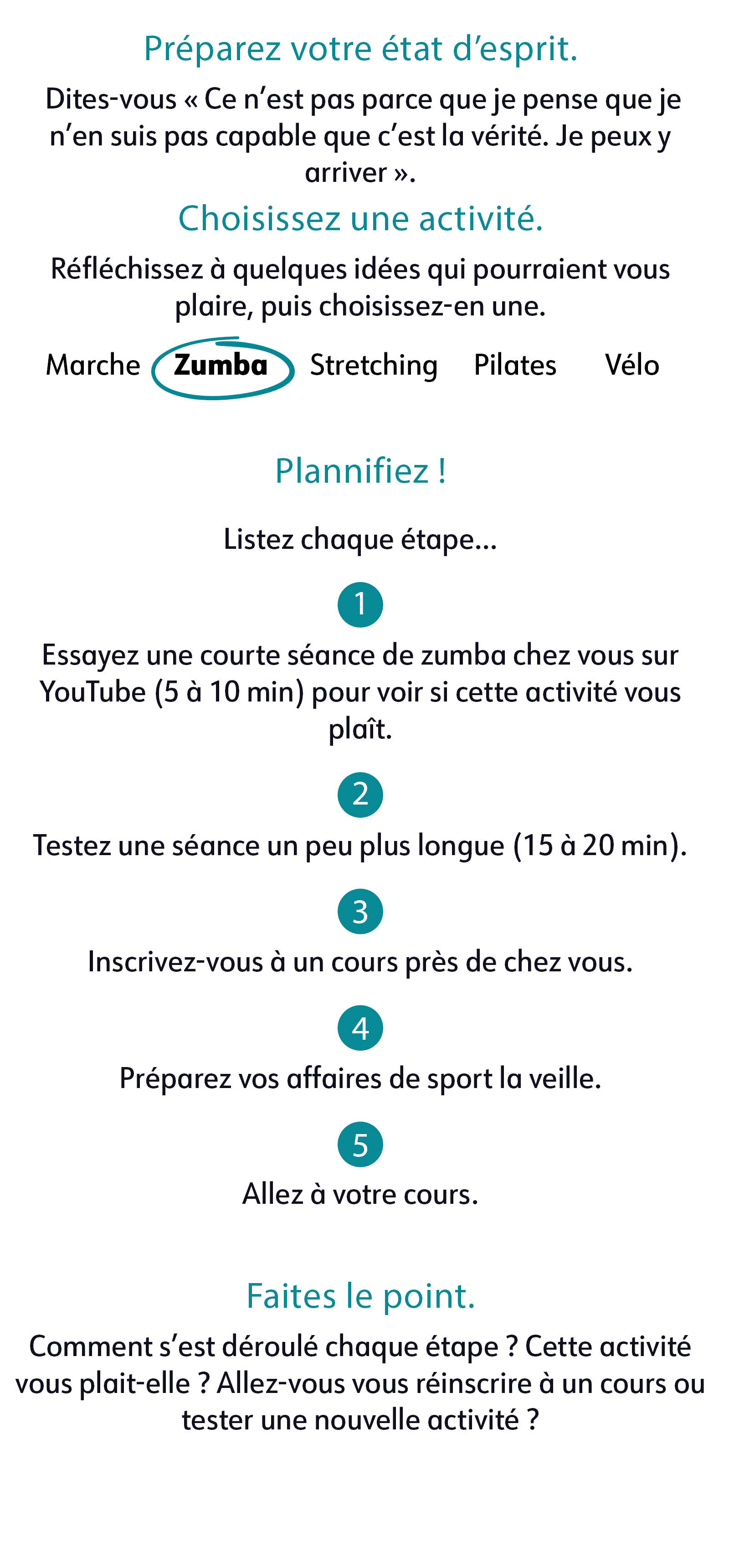 La clé est de ne pas écouter votre cerveau quand il vous dit que vous n’êtes pas suffisamment en forme pour bouger davantage. Sinon, ce type de pensée vous empêchera même d’essayer. En voyant l’activité physique comme plusieurs petites étapes à franchir, devenir plus actif parait plus facile. Et à chaque fois que vous franchissez une étape, vous gagnez plus de confiance en vous pour la suite.