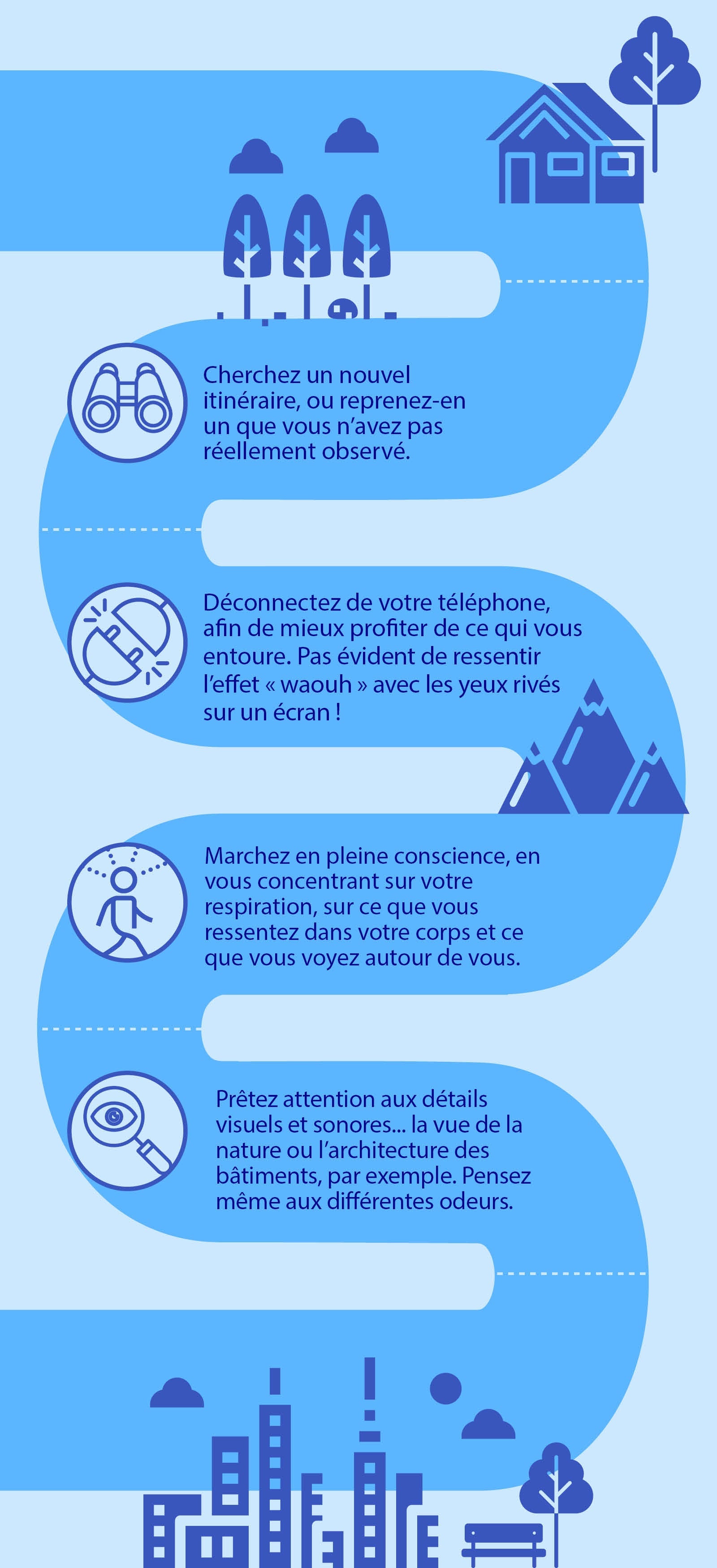 Cela dit, si vous marchez régulièrement autour de chez vous pour rester actif, le fait de toujours revoir le même paysage peut être un peu redondant... Mais quand vous appréciez ce qui vous entoure, en plus de vous faire bouger, votre marche peut vous procurer encore plus de plaisir.