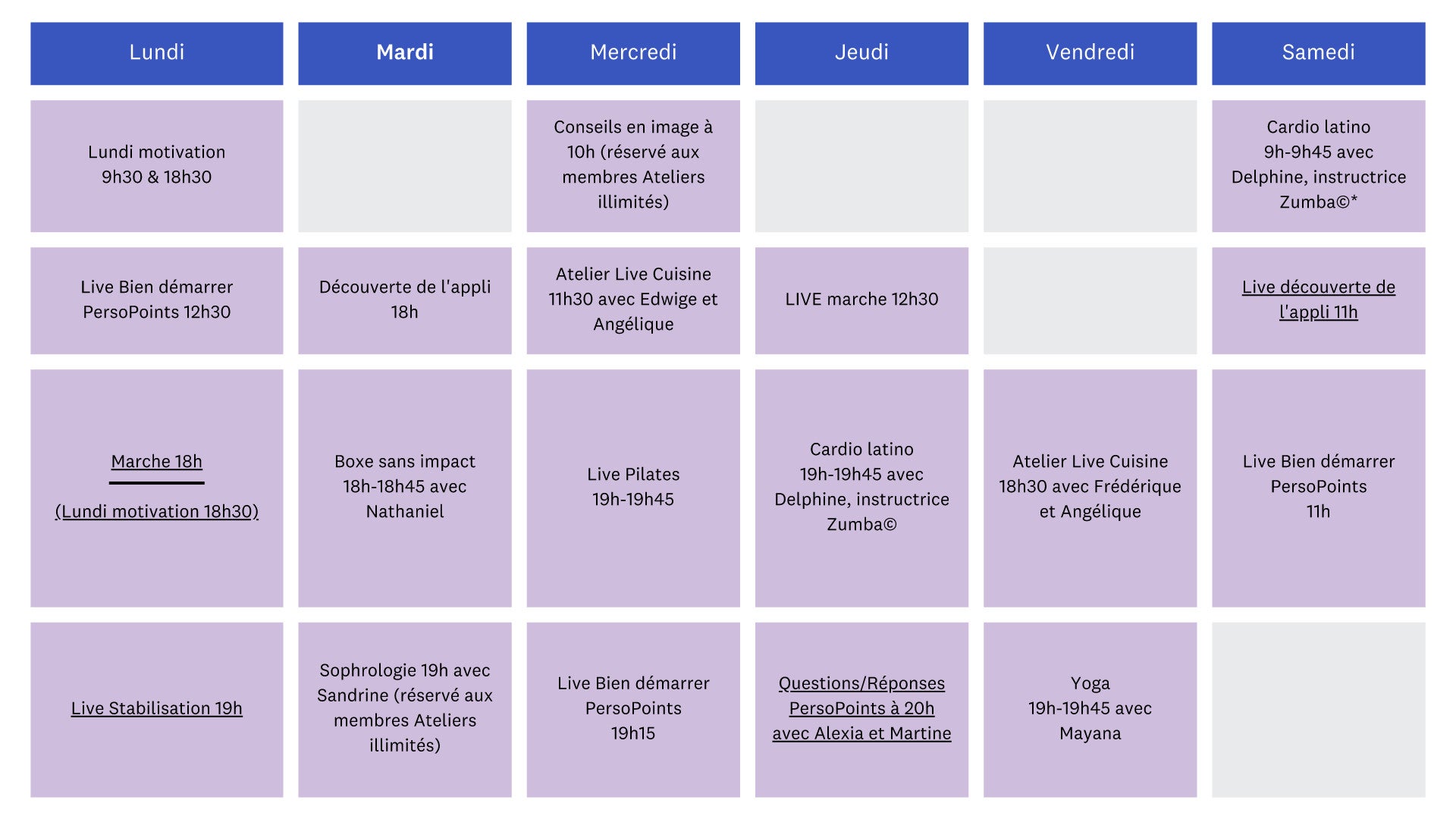 Cette séance de cardio et renforcement musculaire est accessible à tous les niveaux. Il vous suffira d’un tapis et d’un peu d’espace au sol. Peu importe où vous en êtes dans votre parcours, vous pourrez suivre les consignes et exercices en temps réel avec la vidéo. Vous aurez besoin d’environ cinq minutes pour compléter le circuit, mais en fonction de votre temps et de votre niveau, vous pourrez répéter les exercices plusieurs fois (voir le tableau sous la vidéo).