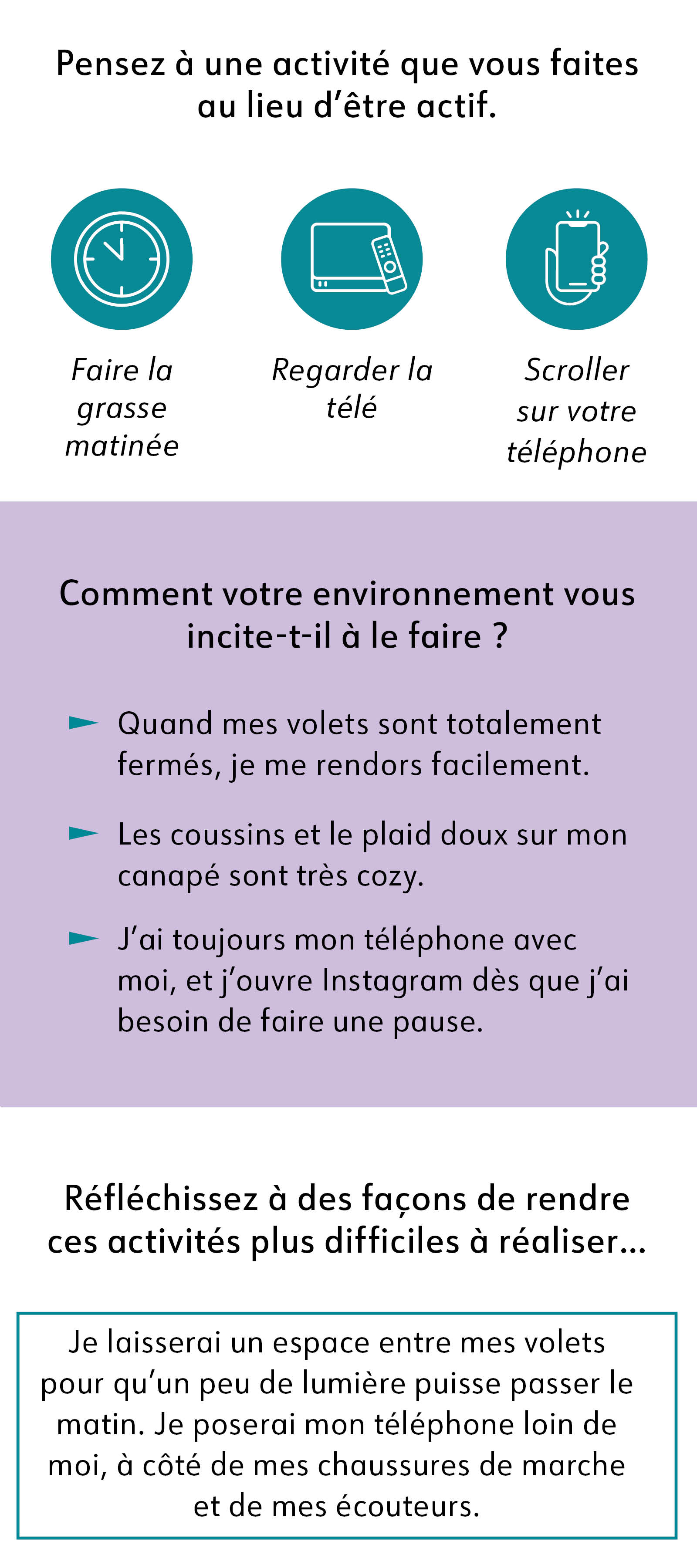 Est-ce que cela veut dire que vous ne devriez jamais dormir plus que prévu ou vous détendre devant la télé ? Bien sûr que non ! Voyez plutôt cette technique comme une façon d’interrompre vos envies de faire ce qui est le plus facile et de vous inciter à être plus actif !