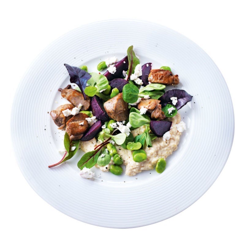 Agneau épicé, houmous, betteraves et fèves.