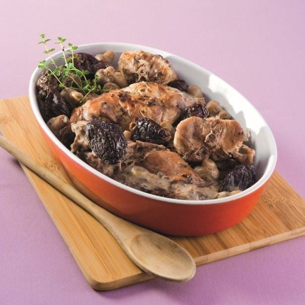Lapin aux pruneaux traditionnel, accompagné d’une brunoise de patates douces (100 g) et de carottes jaunes (150 g) cuites à la poêle avec 1 cc d’huile, du persil et 1/2 gousse d’ail.
