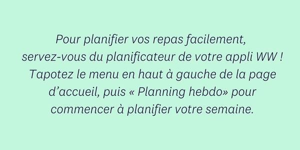 Eh oui ! Ce conseil s’applique autant à votre parcours de perte de poids qu’à votre budget. « En planifiant vos repas pour la semaine, vous vous préparez à acheter uniquement le nécessaire », explique Amélie L. Cela vous laisse aussi l’occasion de réfléchir à la quantité d’aliments dont vous aurez besoin, ainsi qu’au prix de chacun.