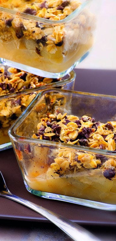 La texture est importante dans un dessert, alors pour apporter du croustillant dans un coupe de yaourt par exemple, on mélange des flocons d’avoine avec de la compote de pomme home made, et on fait cuire le tout au four une trentaine de minutes à 150°C/th.5, pour obtenir un granola healthy à souhait.