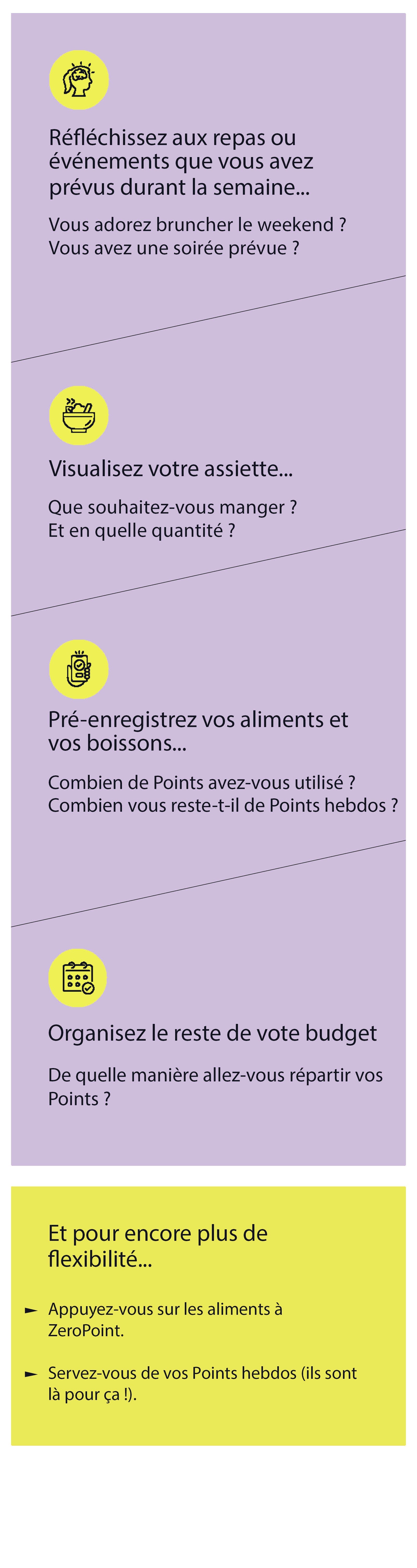 Vous avez sûrement constaté que les choses se passaient de manière plus fluide quand vous planifiiez à l'avance. Prenons quelques exemples : vous réservez dans un restaurant pour une occasion spéciale, vous prévoyez un créneau chaque semaine pour amener votre enfant au sport, ou vous prenez de l'avance dans votre travail pour partir en vacances sereinement... Vous pouvez utiliser la même technique pour vos Points, en « réservant » certains d'entre eux pour les repas qui comptent le plus pour vous. Ensuite, répartissez le reste de manière stratégique !