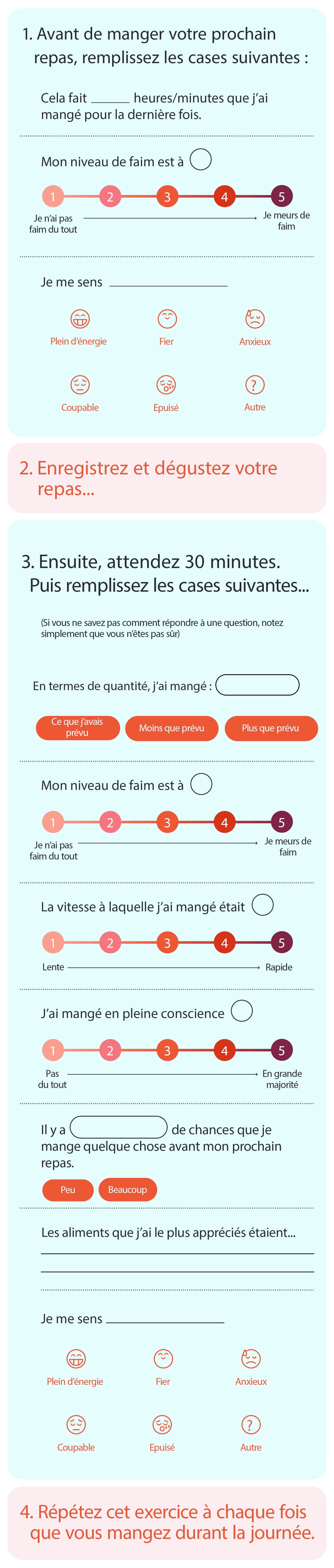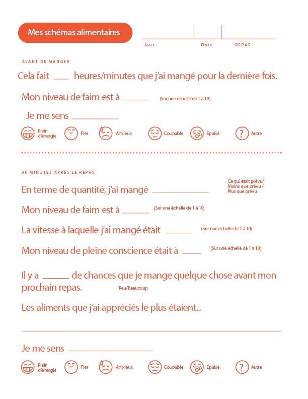 Choisissez trois jours dans la semaine pour prendre note de ce que vous mangez, comment vous mangez et comment vous vous sentez. Suivez les étapes ci-dessous...